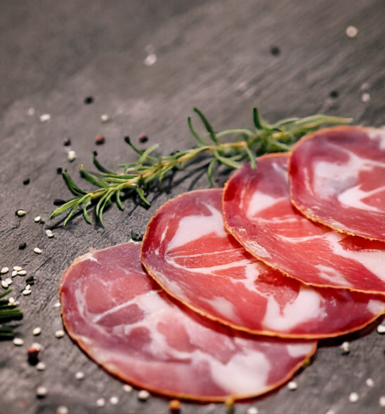 Aus dem Nackenstück des Schweins, in Naturdarm gefüllt und mit schwarzem Pfeffer eingerieben. Nach einer Reifezeit von mindestens 100 Tagen entfaltet sich ein vollmundiges, leicht süßliches Aroma.